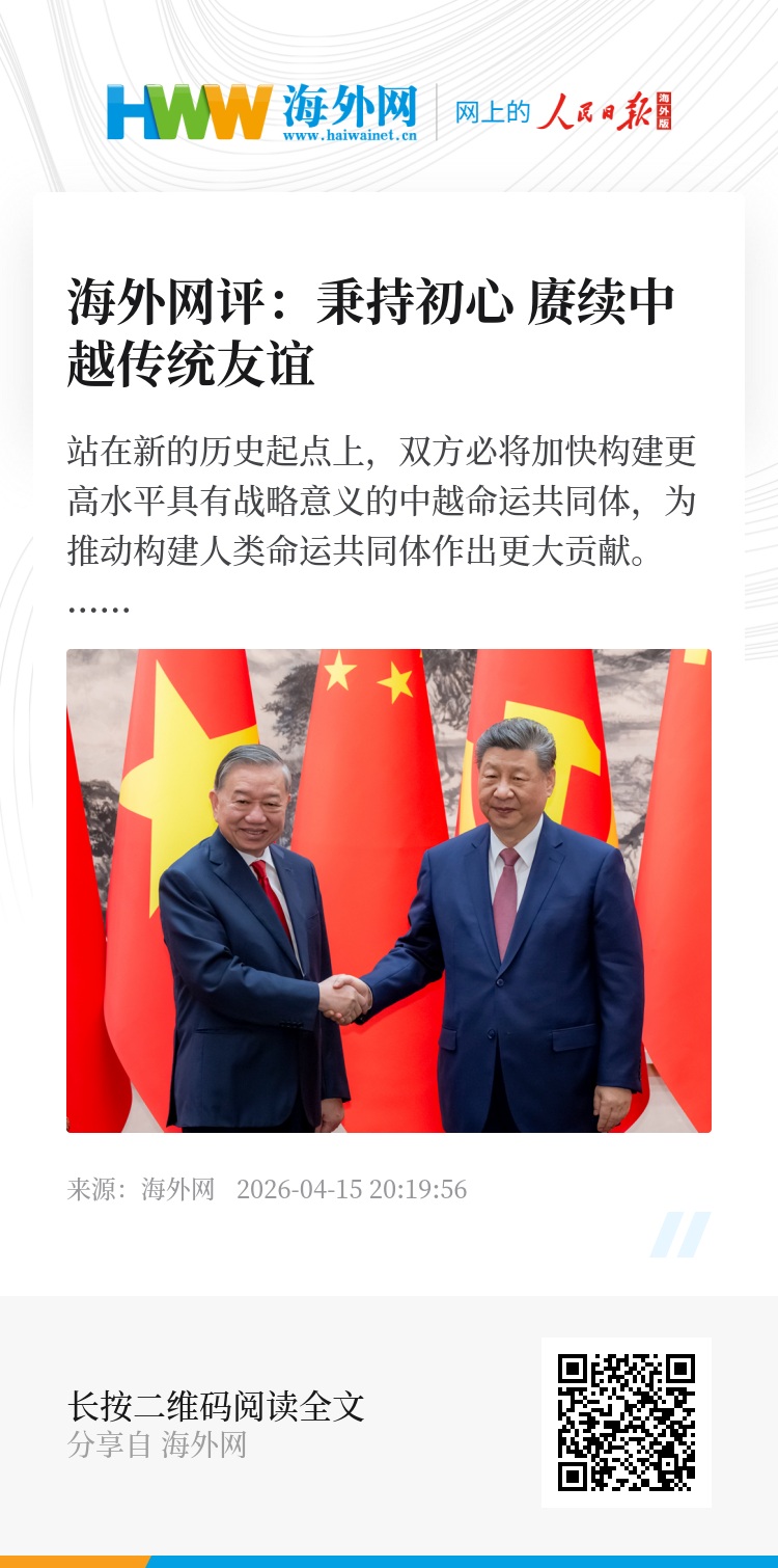 中越领导人这场“春日之约”,赓续了两国传统友好,深化了全面战略合作伙伴关系。站在新的历史起点上,双方将加快构建更高水平具有战略意义的中越命运共同体,为推动构建人类命运共同体作出更大贡献。(海外网评论员)
