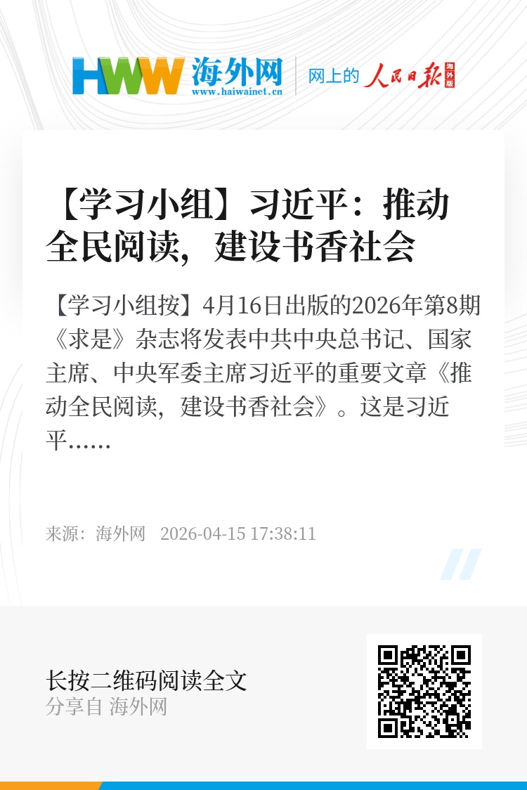 4月16日出版的2026年第8期《求是》杂志将发表中共中央总书记、国家主席、中央军委主席习近平的重要文章《推动全民阅读,建设书香社会》。这是习近平总书记2013年3月至2025年3月期间有关重要论述的节录。