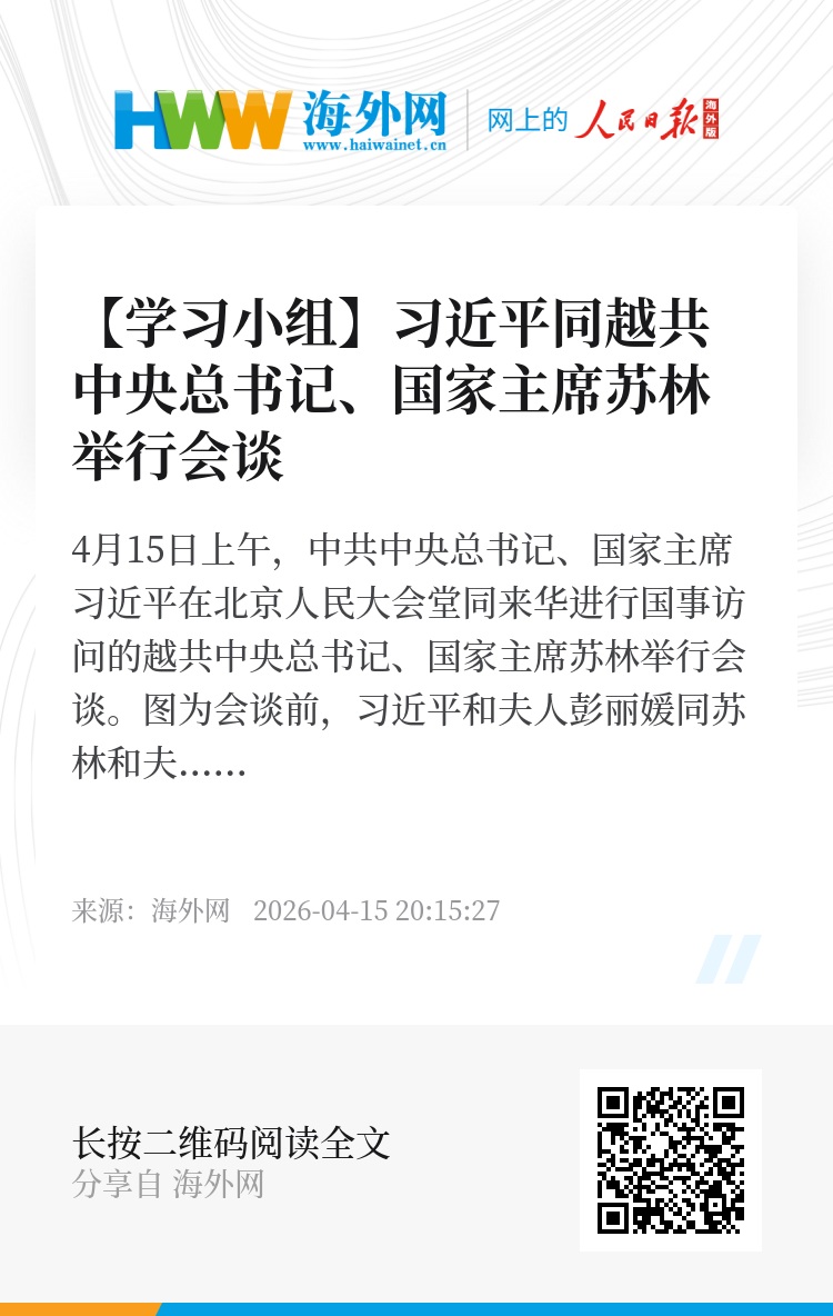 苏林表示,这是我当选越南国家主席后首次出访,也正值习近平总书记、国家主席去年对越进行历史性访问一周年,充分反映了总书记同志所说的“邻里越走越亲”。越方感谢中国共产党、政府和人民对越共十四大提供的重要政治支持,愿始终同中方赓续传统友谊,推动两国全面战略合作伙伴关系和具有战略意义的命运共同体不断发展。越方祝贺中国胜利完成“十四五”规划并取得历史性成就,相信中方将顺利实施“十五五”规划,不断推进高质量发展和社会主义现代化建设,如期实现第二个百年奋斗目标,并成为世界和平发展的支柱力量和首要动力。