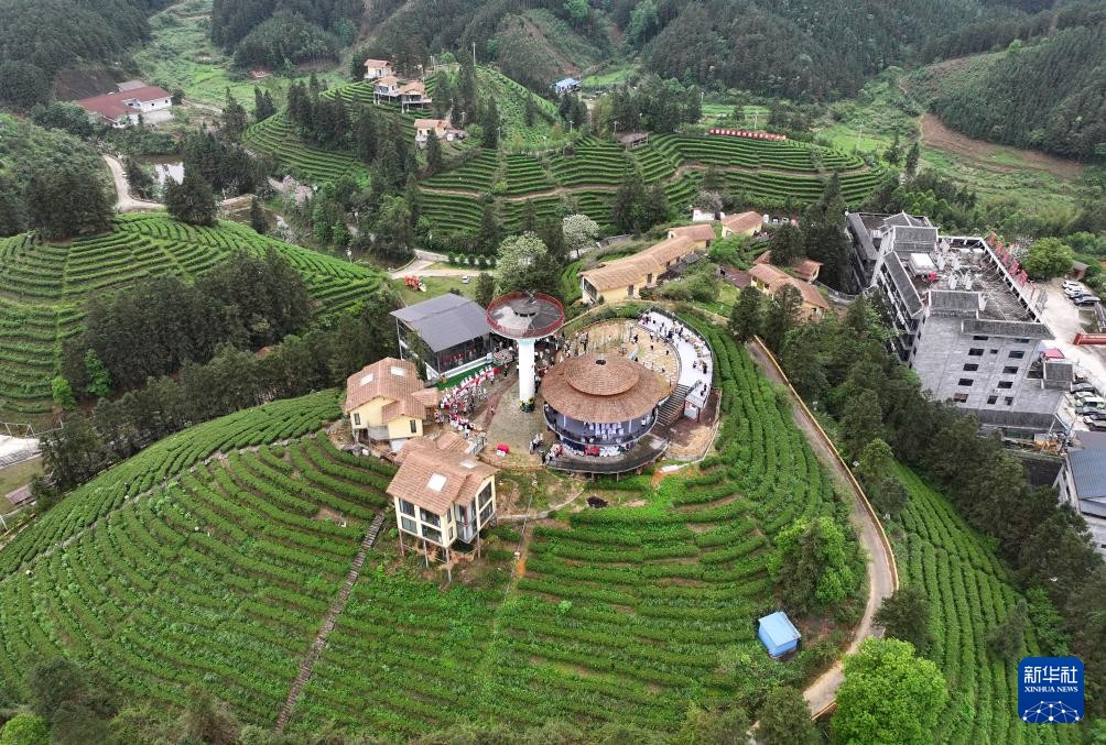 资料图:4月12日,在广西融水苗族自治县水融香粤桂协作现代农业产业园,人们在茶山上品茶、制茶(无人机照片,图/新华社)。
