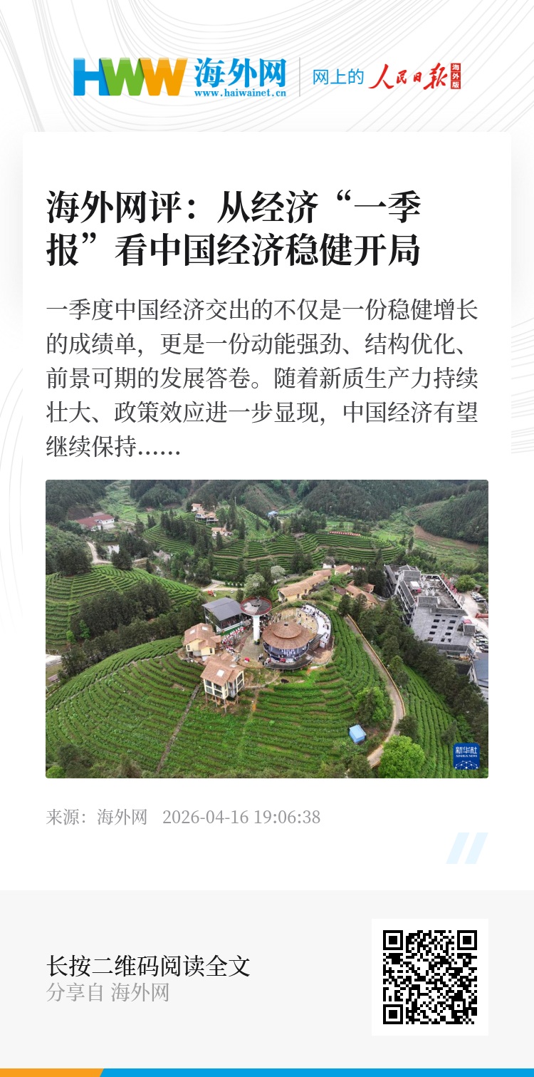 一季度中国经济交出的不仅是一份稳健增长的成绩单,更是一份动能强劲、结构优化、前景可期的发展答卷。随着新质生产力持续壮大、政策效应进一步显现,中国经济有望继续保持稳中向好态势,为全年发展奠定更加坚实基础。(海外网评论员)