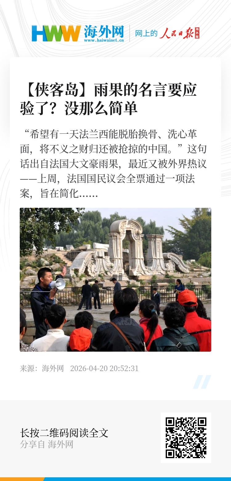 这消息让不少网友挺兴奋。这是不是意味着流失法国的文物可以顺利回家了?昨天,侠客岛微博直播连麦中国国家博物馆图书资料部主任翁淮南,对此进行了深入解读。一起来看看专家怎么说。