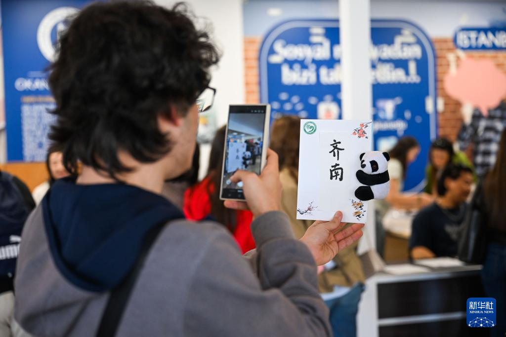 4月20日,在土耳其伊斯坦布尔奥坎大学,学生给自己的中文名字拍照。(图源:新华社)