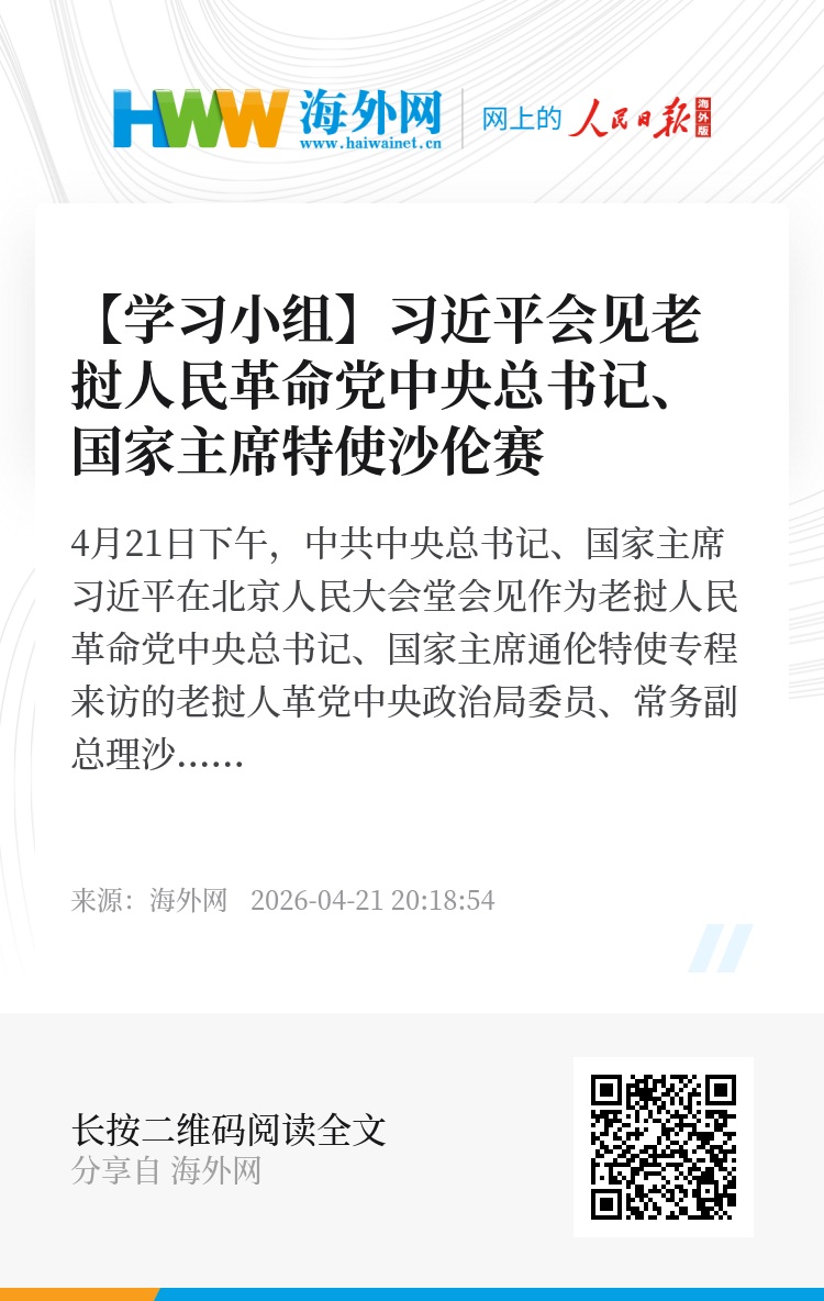 4月21日下午,中共中央总书记、国家主席习近平在人民大会堂会见作为老挝人民革命党中央总书记、国家主席通伦特使专程来访的老挝人革党中央政治局委员、常务副总理沙伦赛。