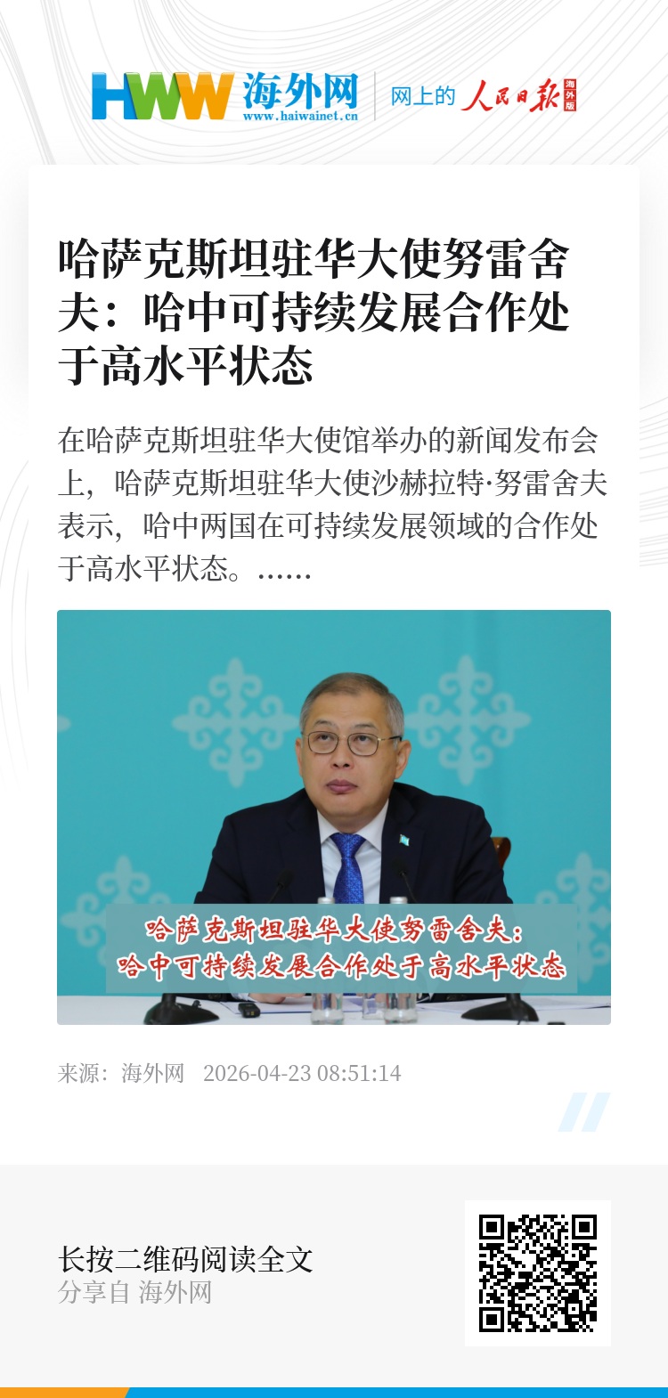 2026年4月22日是第57个世界地球日。在哈萨克斯坦驻华大使馆举办的新闻发布会上,哈萨克斯坦驻华大使沙赫拉特·努雷舍夫表示,哈中两国在可持续发展领域的合作处于高水平状态。