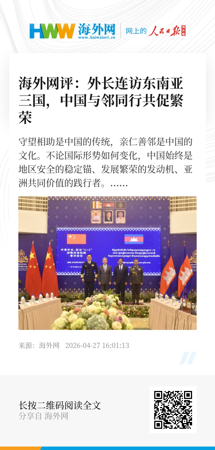 山水相连,命运与共。中国始终秉持亲诚惠容的周边外交理念,坚持与邻为善、以邻为伴,尊重各国主权独立与发展道路选择,不干涉他国内政,不搞地缘博弈,不拉拢对抗,成为东南亚国家最靠谱、最安心的合作伙伴之一。柬埔寨、泰国、缅甸均为中国友好邻邦。深厚的历史积淀与长期合作实践,为此次王毅外长访问筑牢了坚实基础,也让每一次沟通协商都具备高度共识与务实落地的现实条件。在柬埔寨,柬代理国家元首、参议院主席洪森表示,“中国是柬最亲密、最信赖的朋友”“中国的支持与合作是柬实现发展、维护安全的最大底气”;在泰国,泰副总理兼外长西哈萨评价称,“泰中关系源远流长,历经国际风云考验”;在缅甸,缅外长丁貌瑞表示,“缅中是胞波友邻,共同倡导和平共处五项基本原则,树立了国家间友好交往的典范。”法国国际广播电台4月26日评论称,中国外长此次对柬泰缅三国的访问表明“在动荡的当今世界,中国扮演了值得信赖的大国伙伴”。
