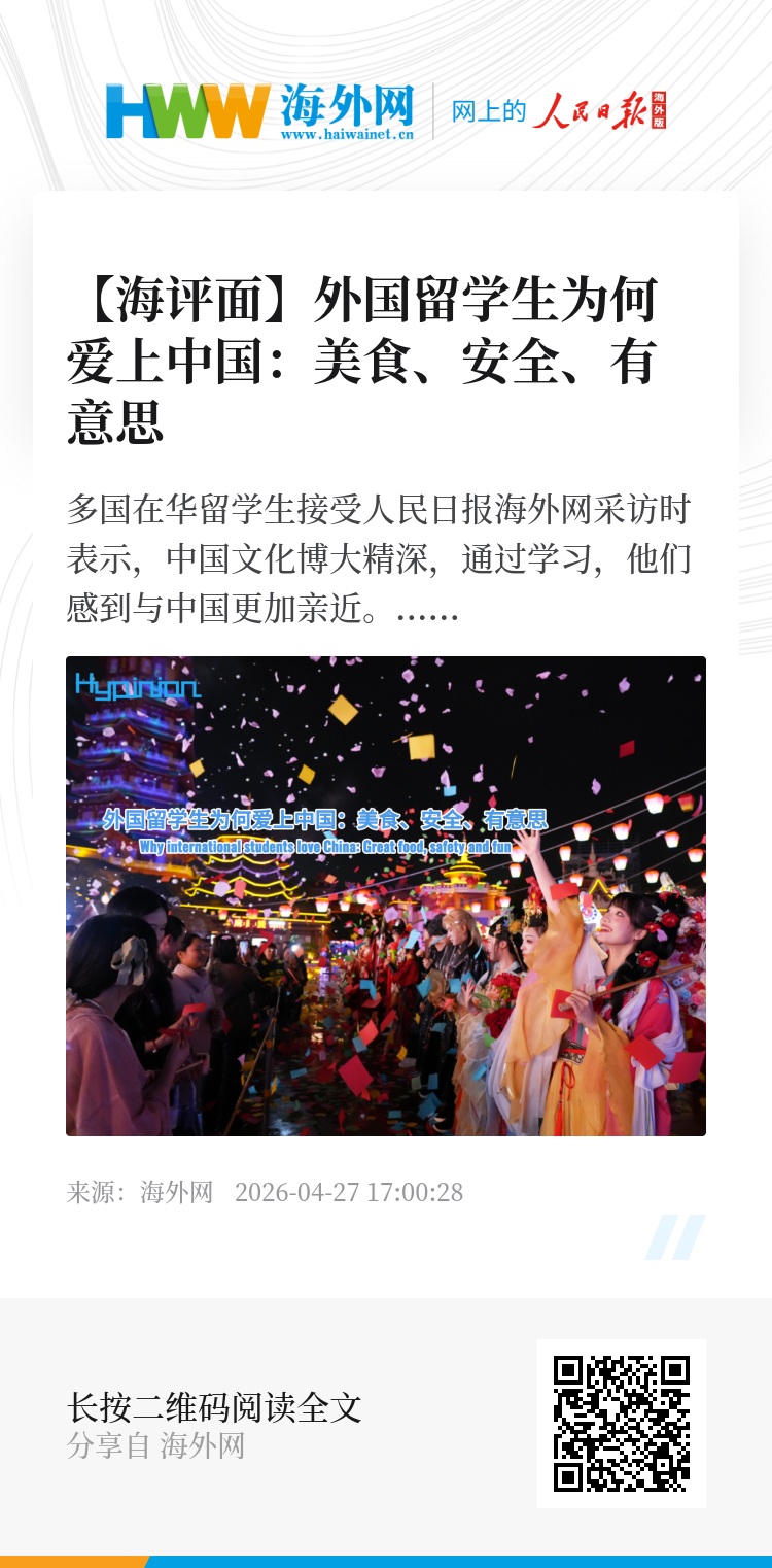 沙特阿拉伯留学生阿来涅兹讲了一个小故事,他曾经在给电动车充电后,把钥匙落在了车上,三天过去,电动车也没有遗失。“我期待未来很多人来到中国学习,因为中国很安全。”他说,这是他特别喜欢中国的地方。阿来涅兹喜欢吃饺子,因为沙特也有类似的美食。中国文化对世界文明兼收并蓄,对于外国友人而言,想找到符合自己口味的美食并非难事。“在北京有很多阿拉伯菜,我特别喜欢,在三里屯、在海淀,有很多。”阿来涅兹表示。