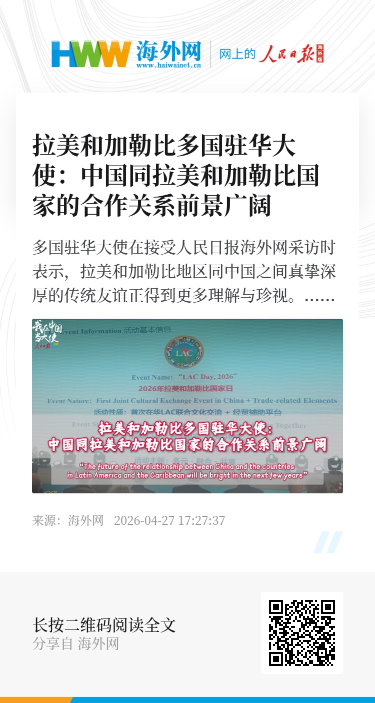 2026拉美和加勒比国家日官方新闻发布会近日在北京举行。发布会上,拉美和加勒比国家驻华使团正式官宣,首届拉美和加勒比国家日活动将于9月19日至20日在北京朝阳公园举办,活动以“多元·融合·共享”为主题,以“海天相连,文明共舞”为口号,打造集文化展示、经贸对接、人文互动于一体的综合性交流盛会。多国驻华大使在接受人民日报海外网采访时表示,拉美和加勒比地区同中国之间真挚深厚的传统友谊正得到更多理解与珍视。