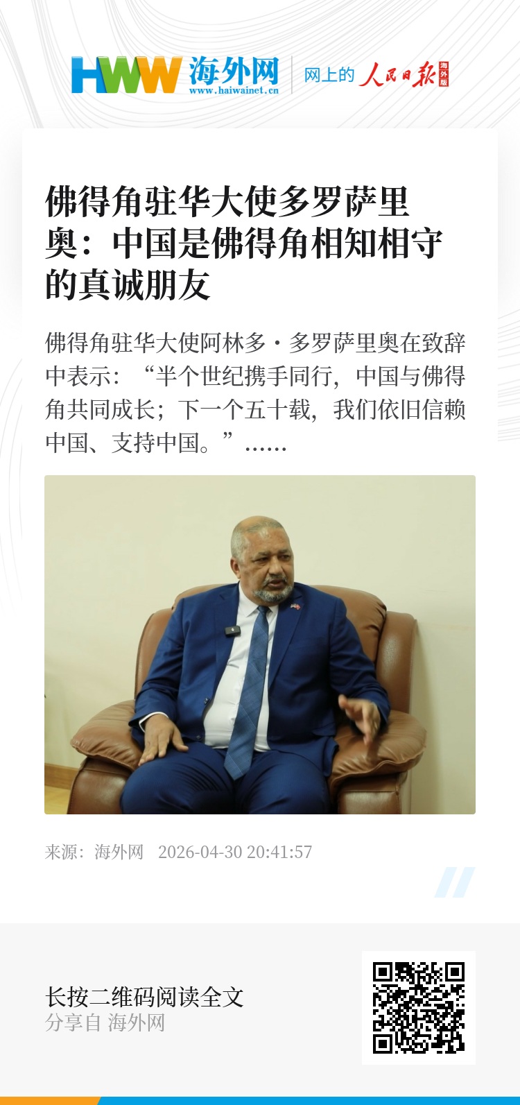 4月29日,中国与佛得角建交50周年纪念活动在北京举行。佛得角驻华大使阿林多・多罗萨里奥在致辞中表示:“半个世纪携手同行,中国与佛得角共同成长;下一个五十载,我们依旧信赖中国、支持中国。”