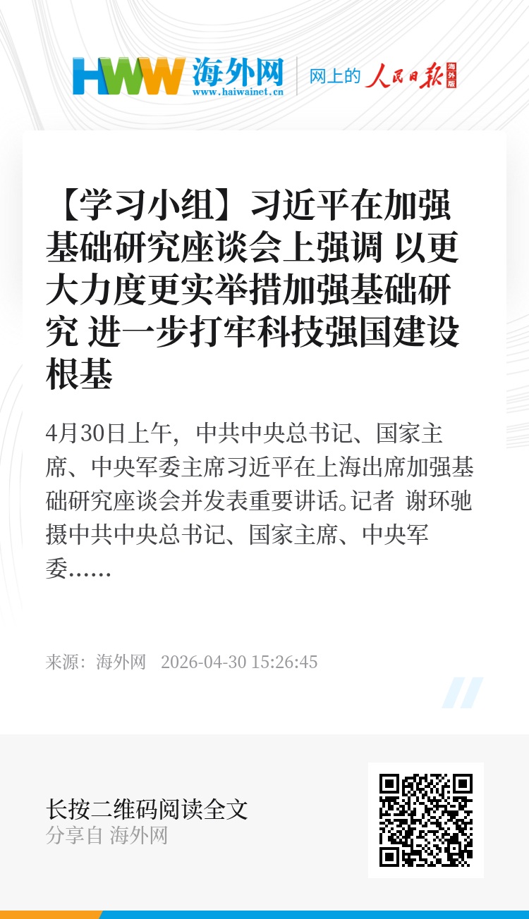 中共中央总书记、国家主席、中央军委主席习近平30日上午在上海出席加强基础研究座谈会并发表重要讲话。他强调,基础研究是整个科学体系的源头,是所有技术问题的总机关。要以更大力度、更实举措加强基础研究,提升我国原始创新能力,进一步打牢科技强国建设根基。