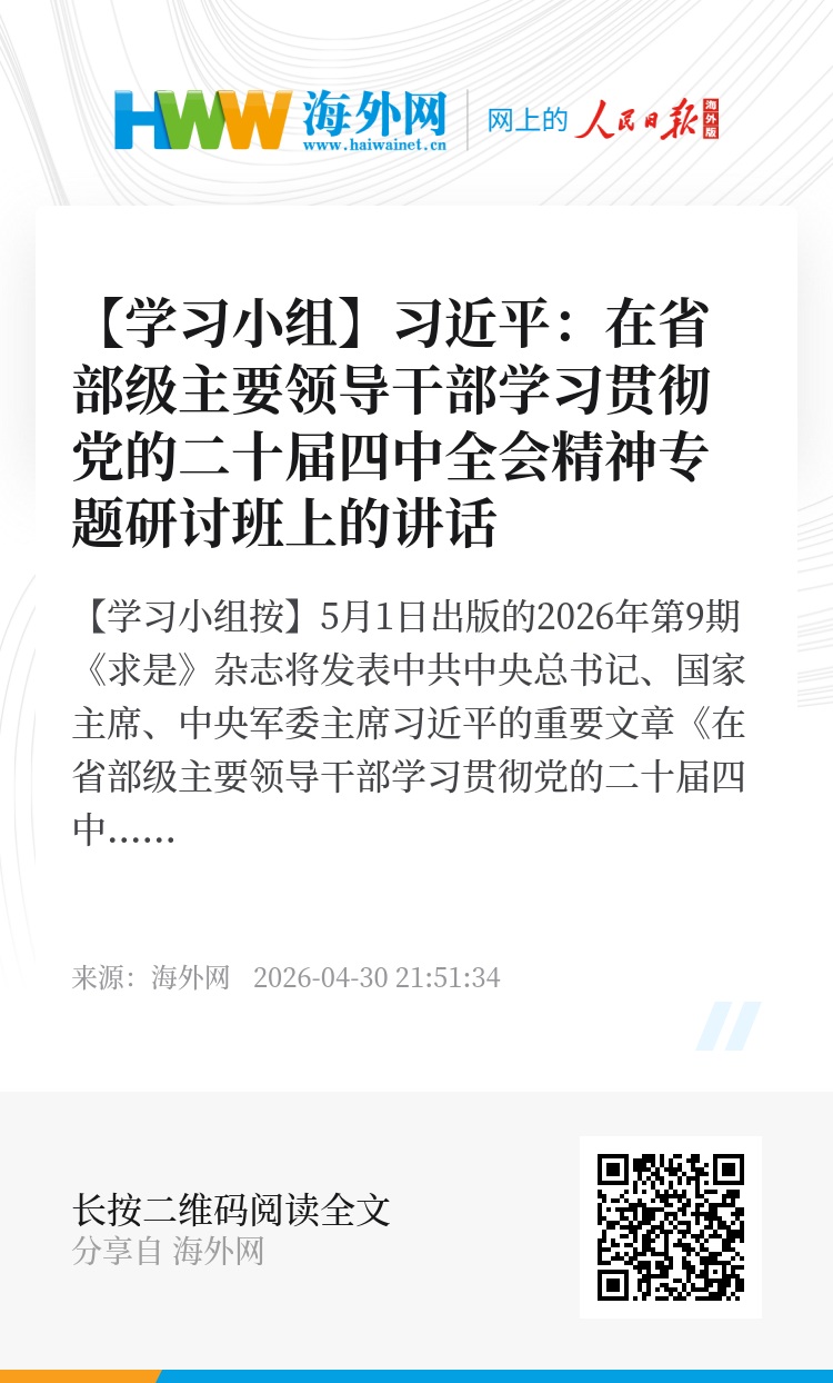 5月1日出版的2026年第9期《求是》杂志将发表中共中央总书记、国家主席、中央军委主席习近平的重要文章《在省部级主要领导干部学习贯彻党的二十届四中全会精神专题研讨班上的讲话》。